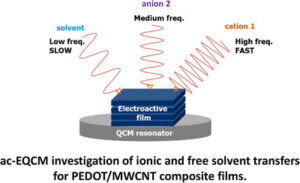 Abstract: Binder-free electrodes are critical for advancing supercapacitor performance. Here, we explore the development of multi-wall carbon nanotubes (MWCNTs) electrodes for supercapacitors by replacing conventional non-conductive polymer binders, such as poly(vinylidene fluoride-co-hexafluoropropylene) (PVDF-HFP), with a conductive polymer, poly(3,4-ethylenedioxythiophene) (PEDOT). PEDOT/MWCNT composite films were synthesized and characterized in an aqueous medium using an electrochemical quartz crystal microbalance (EQCM) and an advanced ac-electrogravimetric technique to investigate their charge storage mechanisms and ionic transfer kinetics. Compared to MWCNTs/PVDF-HFP and pure PEDOT films, the PEDOT/MWCNT composite demonstrates enhanced electrochemical performance, with improved ion concentration and reduced interfacial resistance. The EQCM analysis reveals distinct mass transfer behaviors, highlighting the role of anions, cations, and free water molecules at the interface of electrodes. Ac-electrogravimetry investigation further identifies the kinetics of ion transfer and the relative concentration of each species, showing that the composite film facilitates efficient charge storage. This work provides a new insight into understanding the interfacial behavior of binder-free PEDOT/MWCNT electrode.